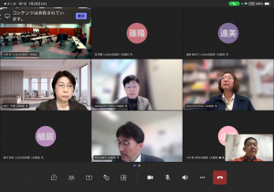 画像のとおり、県庁の会議室と各委員をオンラインで結び、円滑に進行されました。デジタル技術を活用することで、場所を問わず迅速に意見交換ができる環境が整ってきていることを改めて実感しました。