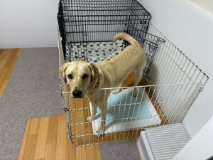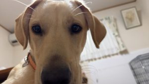 ケージの中でじっとこちらを見つめ、「早く出して!」とアピールするワラちゃん。カメラを向けると好奇心いっぱいの表情で顔を近づけてくる、とても人懐っこい一面も見せてくれます。ワラちゃんとの毎日を通して、盲導犬が多くの愛情と訓練によって育つことを実感しています。ワラちゃんが立派な盲導犬になれるよう、これからも愛情を持って育てていきます。ワラちゃんの成長を一緒に見守っていただけると嬉しいです!