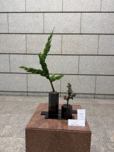 A:水際から立ち上がる姿を天地人三才の形で表現しました。ヒペリカムの花言葉は「きらめき」なんですよ。