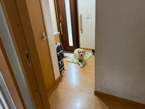 まだ遊びたい盛りの子犬ですが、家族が外出する気配を察すると、この定位置で静かに待っていてくれます。