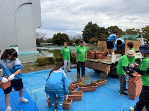 環境美化活動の一環として、行田市総合公園の花壇の花植え準備を、地元の中学生の皆さんと一緒に行いました。